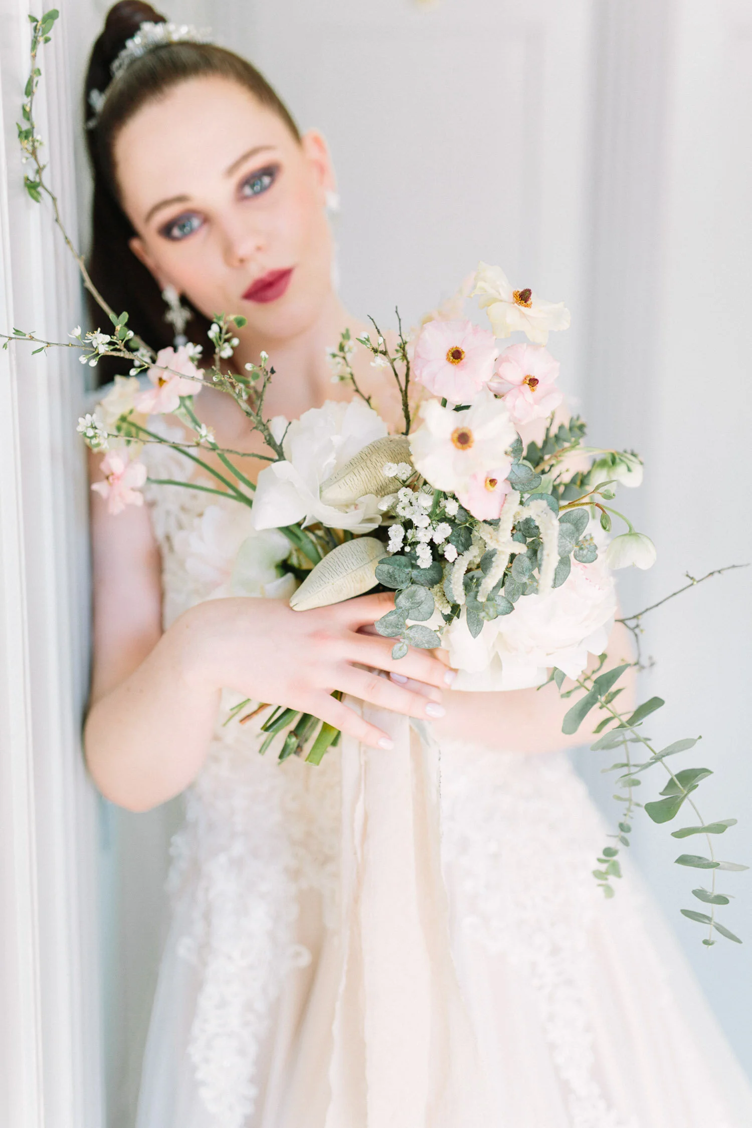 Drei Brautkleider, drei Bräute, eine elegant-kunstvolle Blumeninstallation und auffälliger Schmuck. Eine blumige Inspiration für verschiedene Brauttypen war die Idee dieses Shooting-Projektes. Reduziert auf wenige, dafür aber fertige Details bekommen die Blumen, Kleider, Schmuck und das Styling Raum und können ihre Wirkung entfalten. Im Fine Art-Stil leicht, hell, künstlerisch und feminin.